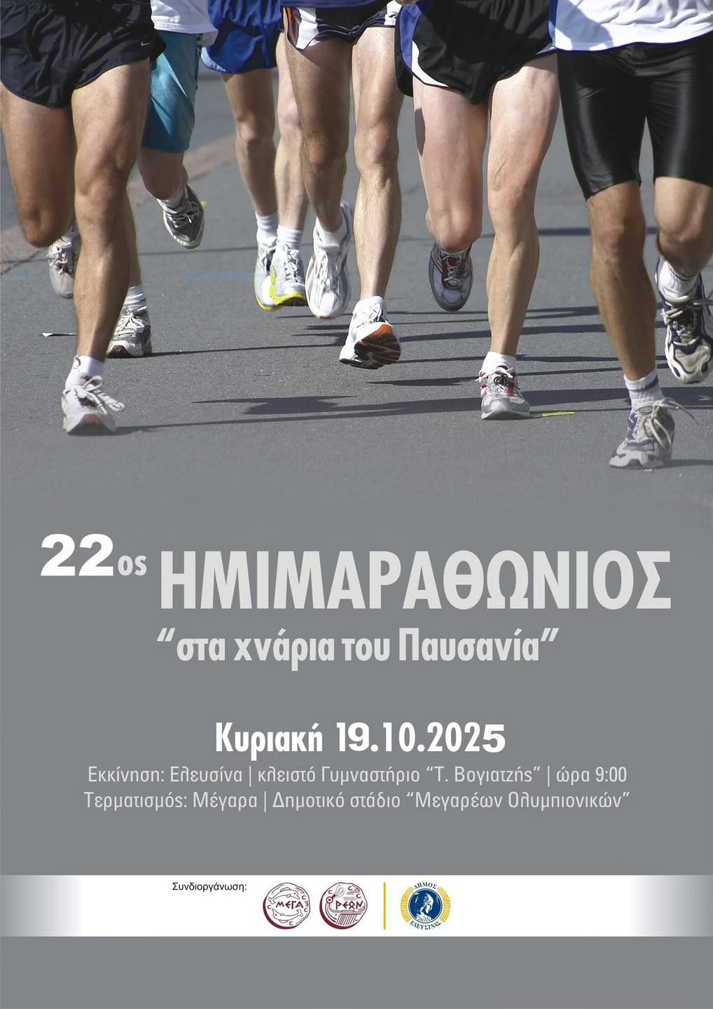 Την Κυριακή 19 Οκτωβρίου 2025, θα πραγματοποιηθεί ο 22ος Ημιμαραθώνιος Δρόμος «Στα χνάρια του Παυσανία», με τη συμμετοχή εκατοντάδων δρομέων και πλήθος επισκεπτών. Στο πλαίσιο της διεξαγωγής του αγώνα, θα εφαρμοστούν έκτακτες κυκλοφοριακές ρυθμίσεις στους Δήμους Ελευσίνας και Μεγαρέων, με προσωρινή και σταδιακή διακοπή της κυκλοφορίας οχημάτων από τις 8:30 το πρωί έως τις 12:00 το μεσημέρι.