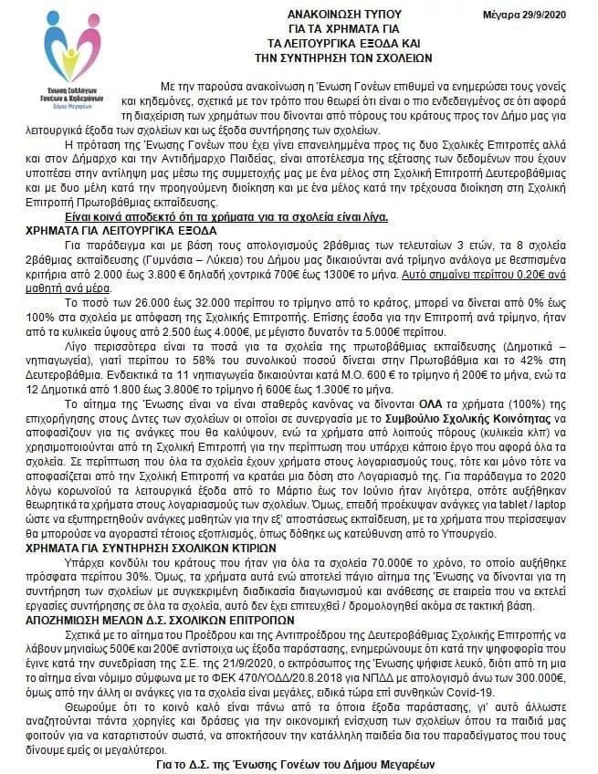 Για το Δ.Σ. της Ένωσης Γονέων του Δήμου Μεγαρέων