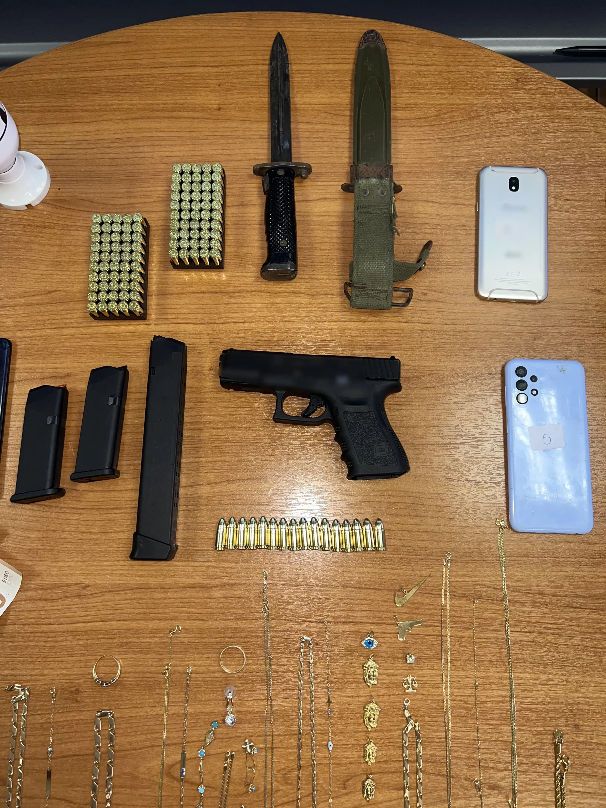 Κατασχέθηκαν πυροβόλο όπλο, -3- γεμιστήρες, ξιφολόγχη στρατιωτικού τύπου, -116- φυσίγγια, -57- κοσμήματα χρυσού χρώματος και -8- κινητά τηλέφωνα