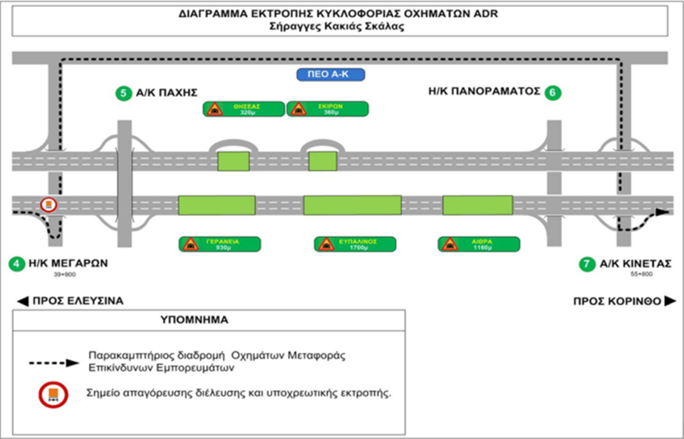 Στο διάστημα αυτό τα συγκεκριμένα οχήματα θα εξυπηρετούνται μέσω της Παλαιάς Εθνικής Οδού μεταξύ των κόμβων Μεγάρων και Κινέτας, όπως φαίνεται στο ακόλουθο σχηματικό διάγραμμα:
