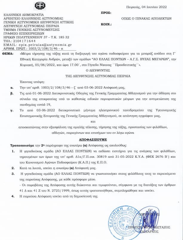 Έτσι με τροποποιητική απόφαση της η Διεύθυνση Αστυνομίας Πειραιά καλεί την ΕΛΛΑΣ ΠΟΝΤΙΩΝ να εκδόσει εισιτήρια για τις ανάγκες των φιλάθλων τηρουμένων των όρων της υπ αριθμ. Δ1α/Γ.Π. οικ 30819 από 31/5/22 ΚΚΥΑ (ΦΕΚ2676 Β’) και του ΚΑΠ της ΕΠΟ.