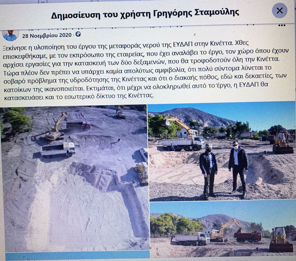 -Το 2016  παραχωρήσαμε  στην ΕΥΔΑΠ Α.Ε. τη μελέτη και τη δυνατότητα εκτέλεσης του έργου, με τη δέσμευση χρηματοδότησης μέσω του ΠΕΠ Αττικής, αλλά και κυρίως διότι η ΕΥΔΑΠ θα αναλάμβανε, να συντάξει την σχετική μελέτη (που ήδη έχει κάνει) και να κατασκευάσει το εσωτερικό δίκτυο ύδρευσης της Κινέτας (που θα κάνει – εξαγγέλθηκε ήδη), που ήταν ένα παρά πολύ μεγάλο ζητούμενο για τις ανάγκες της περιοχής.