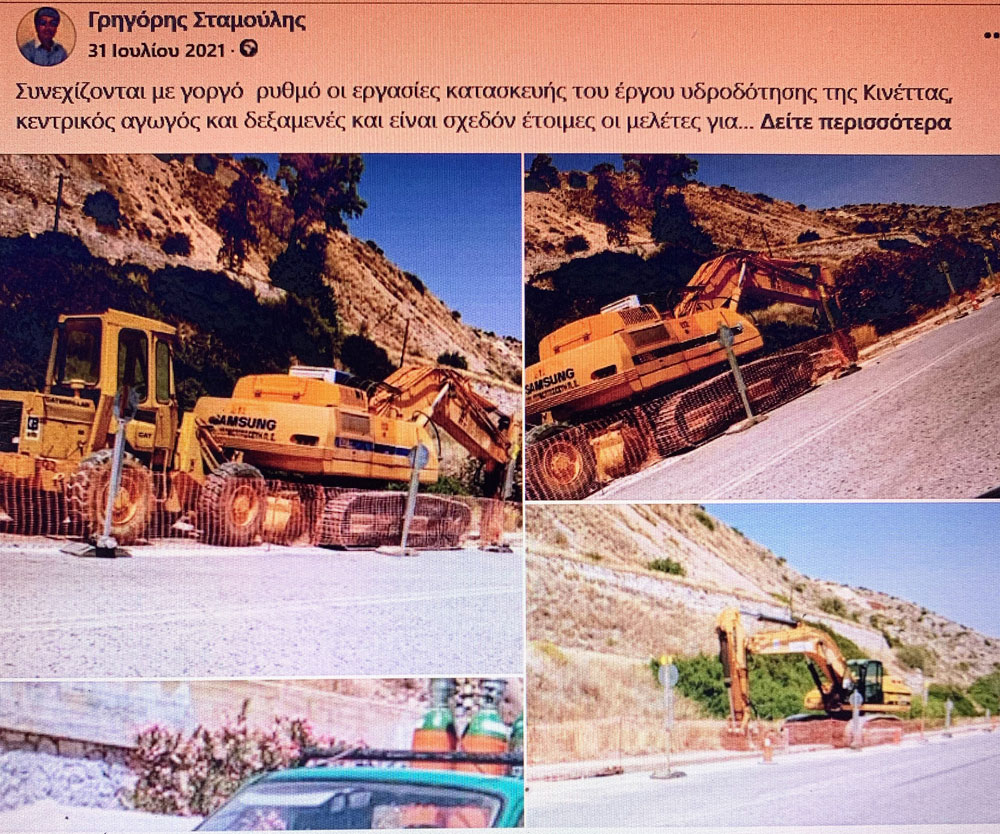 Στην δε Κινέττα, περιοχή Μαρούγκα, όποιος πάει, θα δει τις δύο δεξαμενές των 1500 m³ έκαστη, να είναι η μία έτοιμη και από την άλλη να λείπει μόνο το καπάκι.