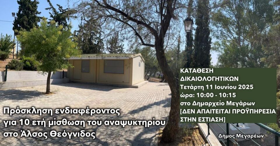 Ο Δήμος Μεγαρέων προχωρά σε επαναληπτικό δημόσιο πλειοδοτικό διαγωνισμό για την εκμίσθωση του ισογείου καταστήματος – αναψυκτηρίου που βρίσκεται στο Άλσος Θεόγνιδος, στη θέση Κουρκούρι, εντός του Ο.Τ. 337 της πόλεως Μεγάρων.