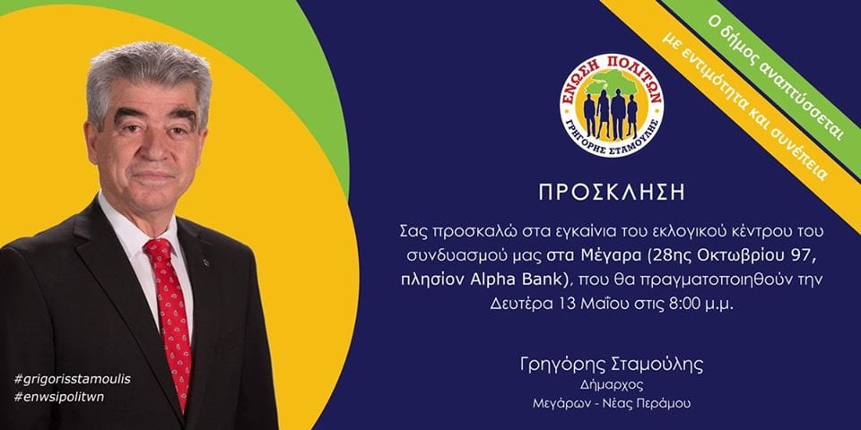 Ο Ανεξάρτητος συνδυασμός «Ένωση Πολιτών» με επικεφαλής και υποψήφιο δήμαρχο Μεγάρων και Νέας Περάμου τον Γρηγόρη Σταμούλη την Δευτέρα 13 Μαΐου 2019, ώρα 8 το βράδυ. θα πραγματοποιήσει τα εγκαίνια του Εκλογικού Κέντρου του συνδυασμού στα Μέγαρα (28ης Οκτωβρίου 97 πλησίον Alpha Bank).