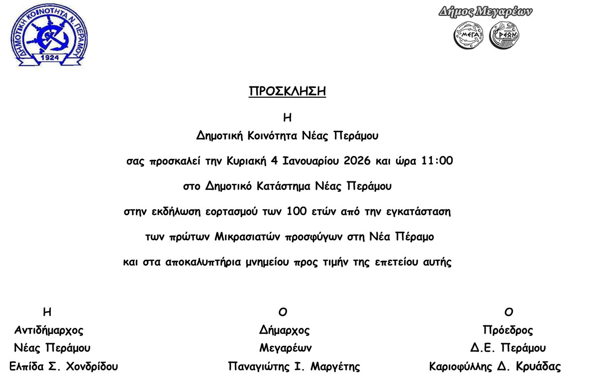 Την Κυριακή 4 Ιανουαρίου 2026, στις 11:00 π.μ., η Δημοτική Κοινότητα Νέας Περάμου προσκαλεί τους πολίτες στο Δημοτικό Κατάστημα, προκειμένου να αποδοθεί φόρος τιμής στη μακρόχρονη πορεία του τόπου και να διατηρηθεί ζωντανή η μνήμη των πρώτων Μικρασιατών που εγκαταστάθηκαν στην περιοχή πριν από εκατό χρόνια.