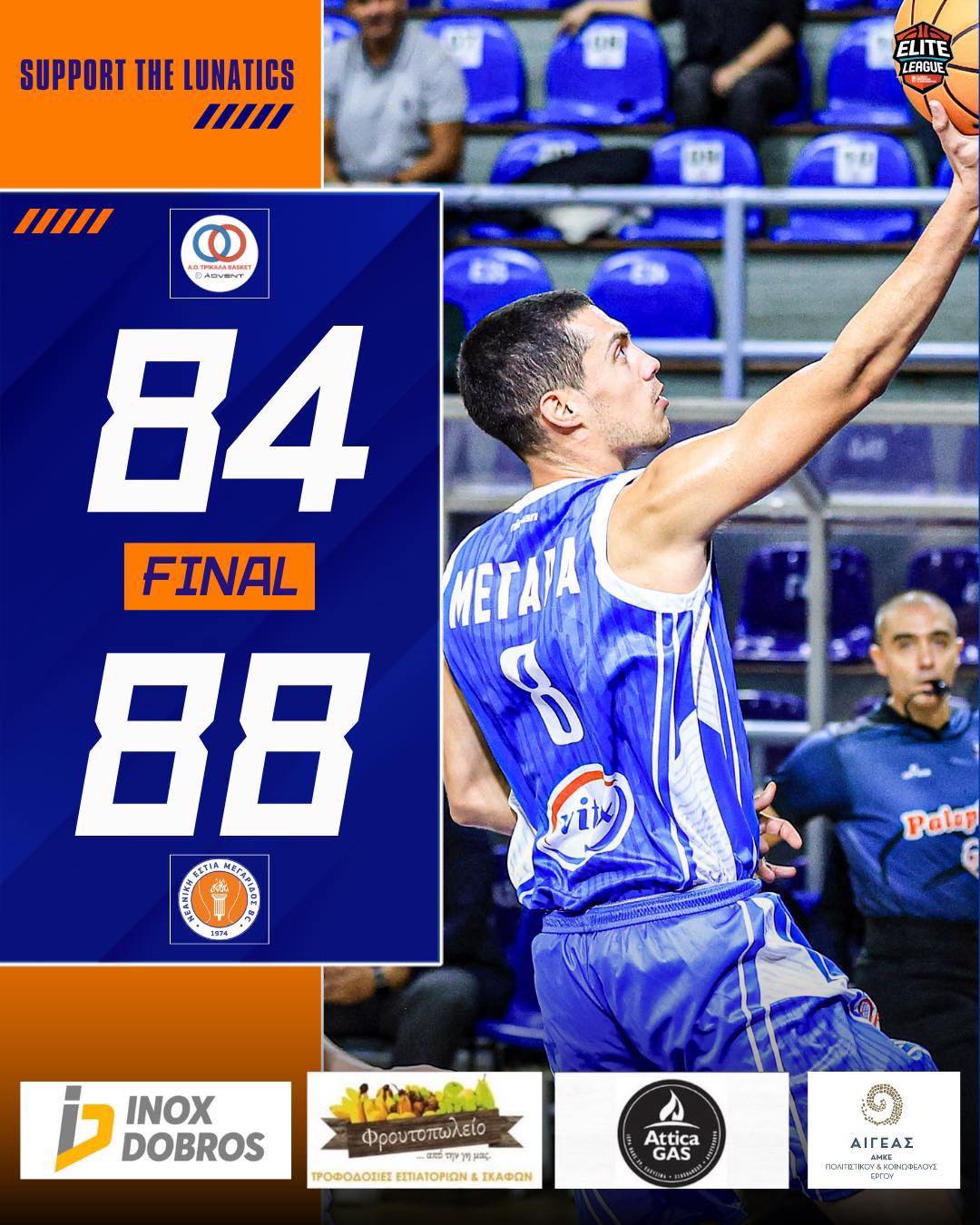 Η ΝΕ Μεγαρίδας συνάντησε σθεναρή αντίσταση στα Τρίκαλα, από την τοπική ομάδα που έδειξε ότι έχει σφυγμό και πείσμα, όμως επιβεβαίωσε την ανωτερότητάς, έφυγε με νίκη 88-84 και παρέμεινε στην κορυφή με ρεκόρ 6-1, περιμένοντας τα αποτελέσματα των “συγκάτοικών” της που άρχισαν αργότερα τα ματς.