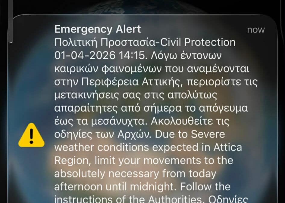 Μήνυμα από το 112 εστάλη σε όσους βρίσκονται στην Αττική λόγω των έντονων φαινομένων που αναμένονται από την κακοκαιρία Erminio.