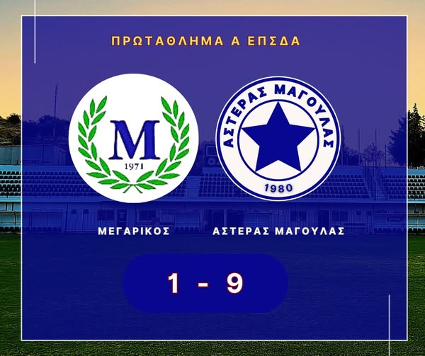 Εντυπωσιακή εμφάνιση πραγματοποίησε ο Αστέρας Μαγούλας, συντρίβοντας τον Μεγαρικό με το αστρονομικό 1-9, στο πλαίσιο της 5ης αγωνιστικής της Α’ κατηγορίας. Με τη νίκη αυτή, οι «μπλε» συνέχισαν το απόλυτο σερί τους, φτάνοντας στις πέντε νίκες σε ισάριθμους αγώνες και παραμένοντας στην κορυφή της βαθμολογίας.