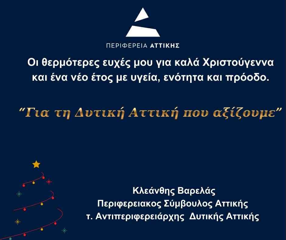 Τις θερμές του ευχές για τις Άγιες Ημέρες των Χριστουγέννων και τον ερχομό του νέου έτους απευθύνει ο Περιφερειακός Σύμβουλος Αττικής και τ. Αντιπεριφερειάρχης Δυτικής Αττικής, κ. Κλεάνθης Βαρελάς, στέλνοντας μήνυμα υγείας, ενότητας και προόδου.