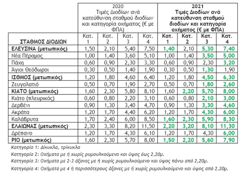 Ειδικά στους μετωπικούς σταθμούς Ελαιώνα και Ρίου η μείωση αφορά όλες τις κατηγορίες οχημάτων. Με τις νέες τιμές το ταξίδι Αθήνα – Πάτρα για ένα ΙΧ επιβατικό διαμορφώνεται στα 11,50€ (από 11,80€), ενώ στις κατηγορίες 3 και 4 η μείωση για το ίδιο ταξίδι είναι 0,50€ και 0,60€ αντίστοιχα.