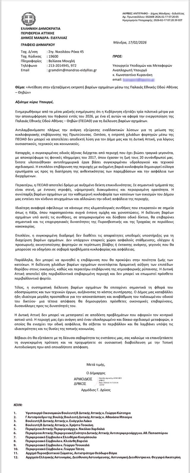 Ο Δήμαρχος Αρμόδιος Γ. Δρίκος αντιδρά στην προτεινόμενη εκτροπή βαρέων οχημάτων μέσω της Παλαιάς Εθνικής Οδού Αθήνας – Θηβών, υπερασπιζόμενος τους πολίτες, το περιβάλλον και την ποιότητα ζωής.