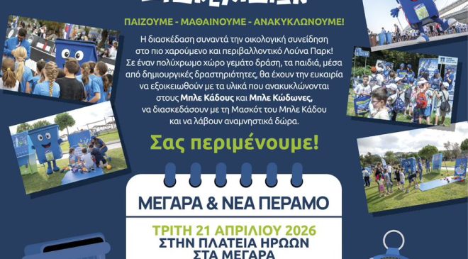 • Την Τρίτη 21 Απριλίου 2026, στην πλατεία Ηρώων στα Μέγαρα, από τις 09:00 έως τις 13:00