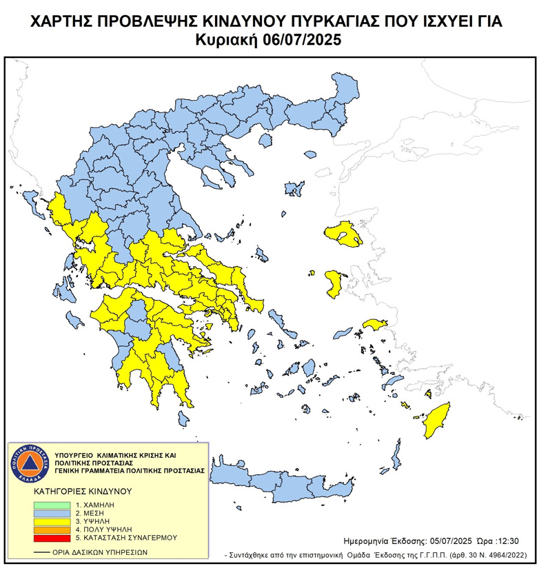 Υψηλός κίνδυνος πυρκαγιάς προβλέπεται για σήμερα, Κυριακή 6 Ιουλίου, σε αρκετές περιοχές της χώρας, σύμφωνα με τον Χάρτη Πρόβλεψης Κινδύνου Πυρκαγιάς, που εκδίδει η γενική γραμματεία Πολιτικής Προστασίας του υπουργείου Κλιματικής Κρίσης και Πολιτικής Προστασίας.